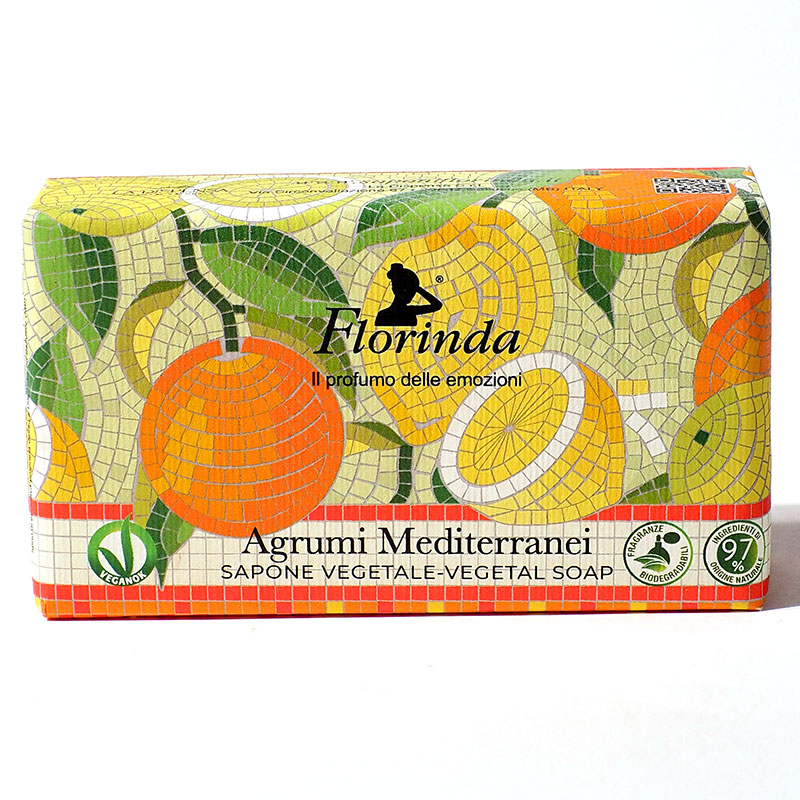 Eine hochwertige Pflanzenseife mit dem Duft nach mediterranen Zitrusfrüchten aus der Mosaici Italiani Serie von Florinda.
